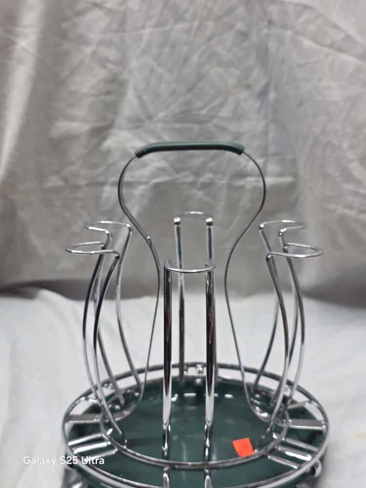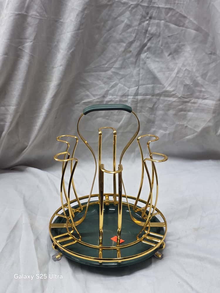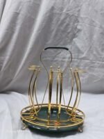 Be the first to review “Enhance your kitchen or dining setup with this elegant gold metal glass holder stand. Designed for both style and function, it securely holds multiple glasses, keeping them organized and dry. Made from high-quality stainless steel with a gold finish and a” Cancel reply